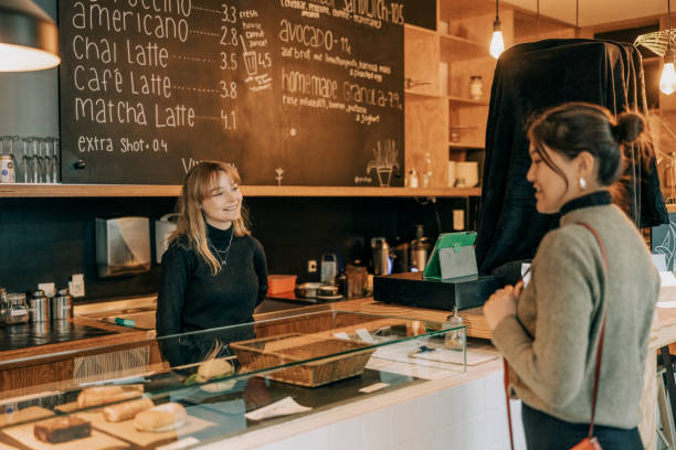 Inti dari pengalaman coffee shop yang sukses adalah hubungan manusia. Dalam gambar ini, interaksi antara barista wanita berambut pirang yang tersenyum di belakang konter dan pelanggan wanita berambut gelap yang menghadapnya adalah bukti keramahan tersebut. Senyum tulus sang barista melampaui transaksi komersial; itu adalah isyarat keramahan yang membuat pelanggan merasa dihargai dan disambut.